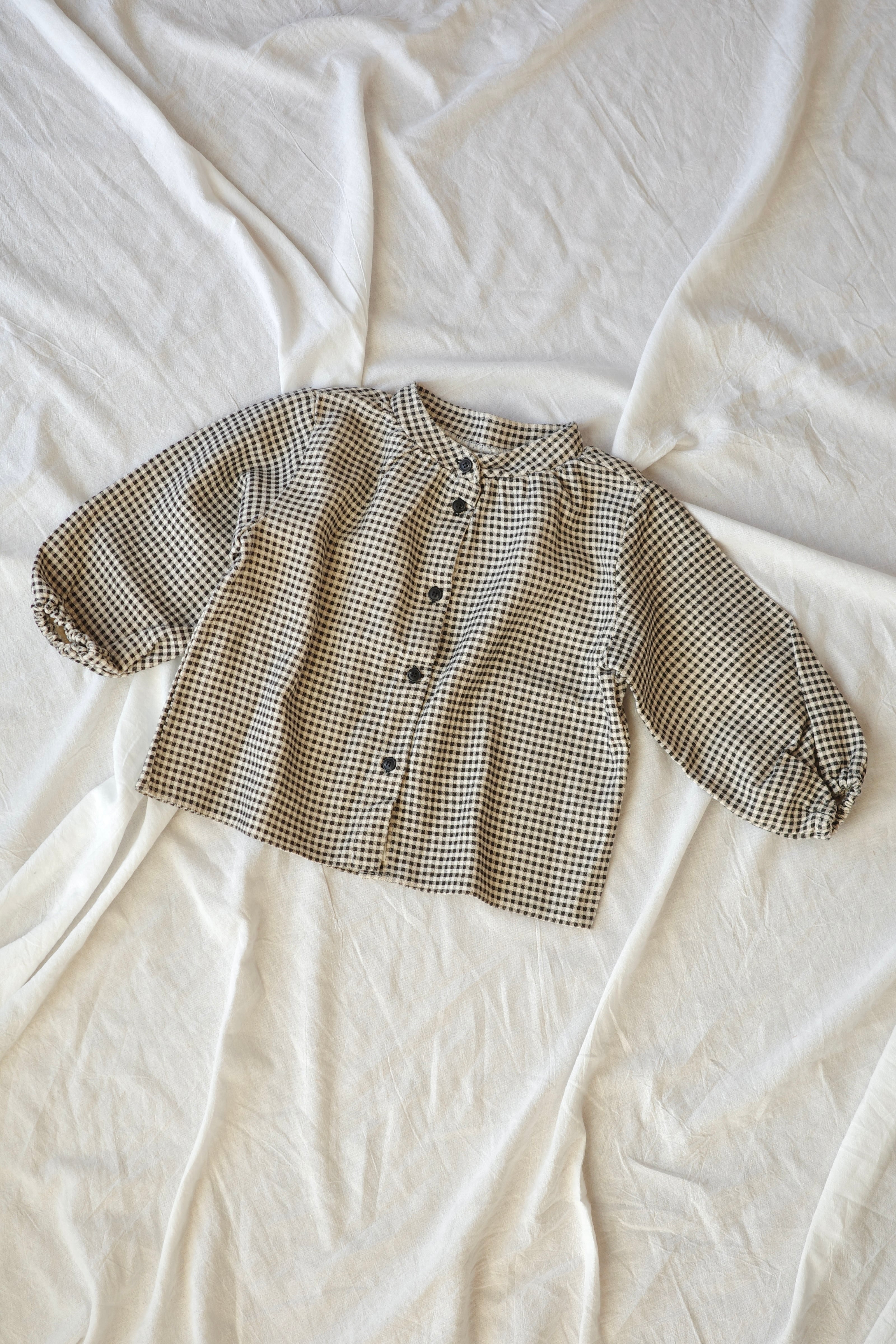 ヘンリーネックに控えめなギャザーをあしらい、